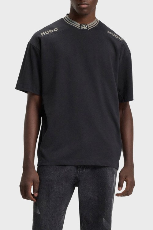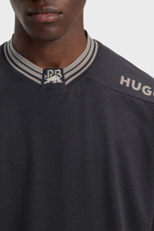 Детали: Мужская темно-серая хлопковая футболка Dydall от Hugo by Hugo Boss (Хуго бай Хуго Босс). Логотип на плечах, круглый вырез горловины с вышивкой, короткий рукав, классическая длина