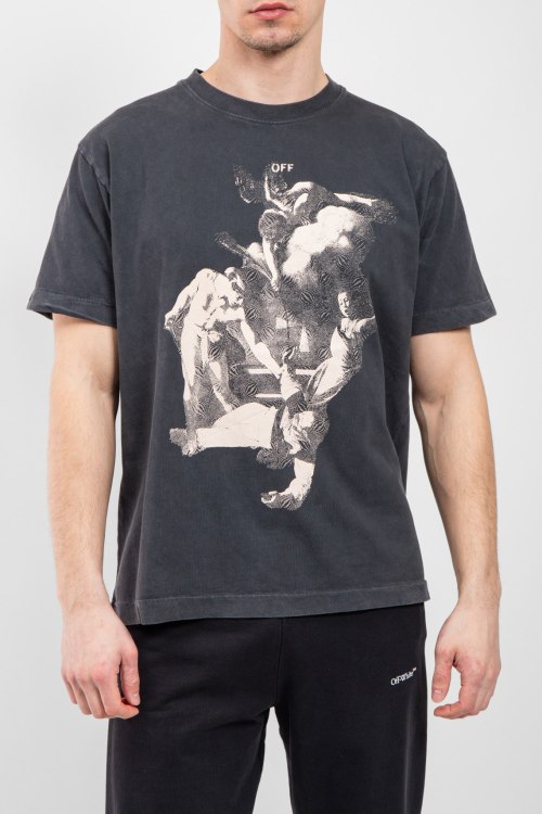 Мужская темно-серая хлопковая футболка Martyrdom от Off-White (Офф-Вайт).Графический принт на груди и на спине, круглый вырез горловины, короткий рукав, классическая длина.