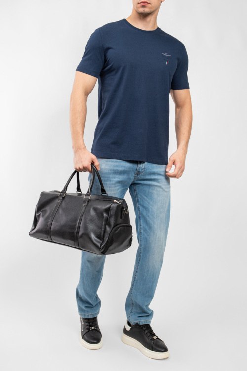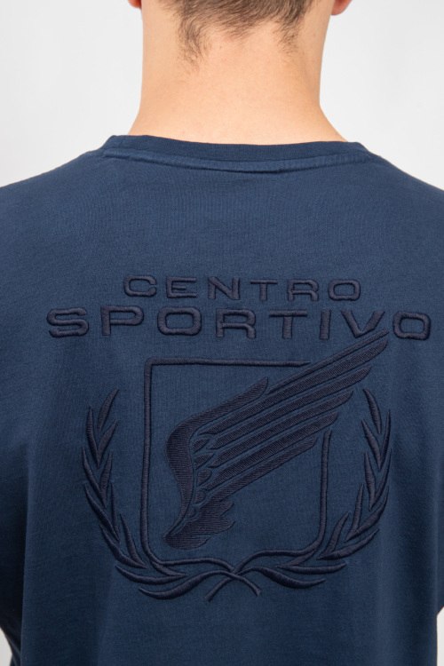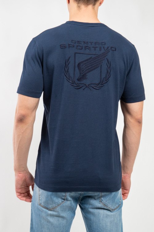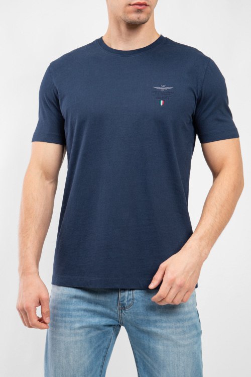 Мужская темно-синяя хлопковая футболка от Aeronautica Militare (Аэронавтика Милитари). Логотип на груди, вышивка на спине, круглый вырез горловины, короткий рукав, классическая длина.