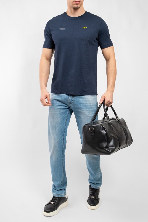 Мужская темно-синяя хлопковая футболка от Aeronautica Militare (Аэронавтика Милитари). Логотип на груди, круглый вырез горловины, короткий рукав, классическая длина.