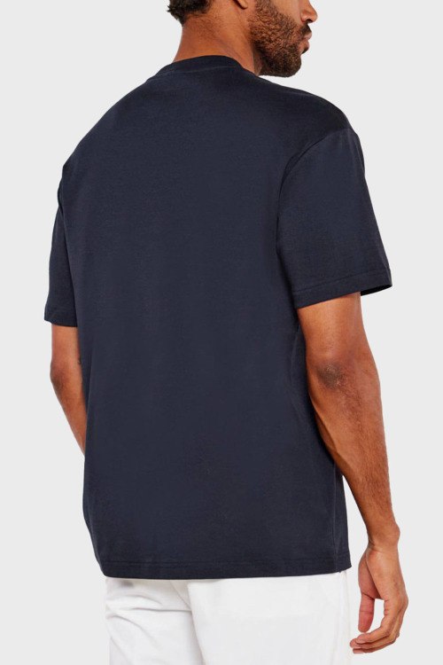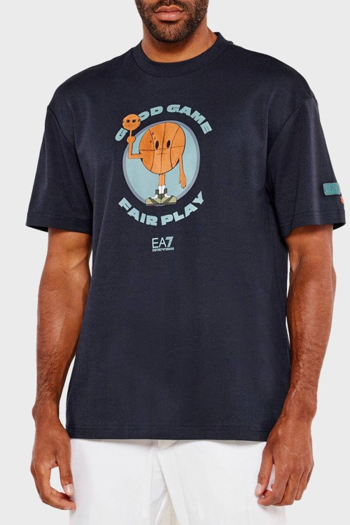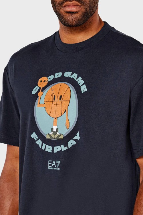 Детали: Мужская темно-синяя хлопковая футболка от EA7 Emporio Armani (ЕА7 Эмпорио Армани). Принт на груди, круглый вырез горловины, короткий рукав, классическая длина