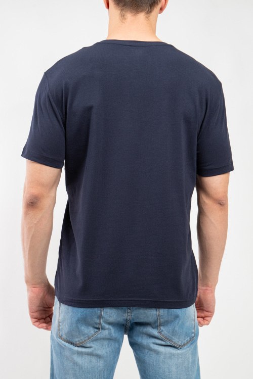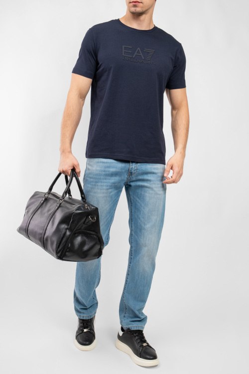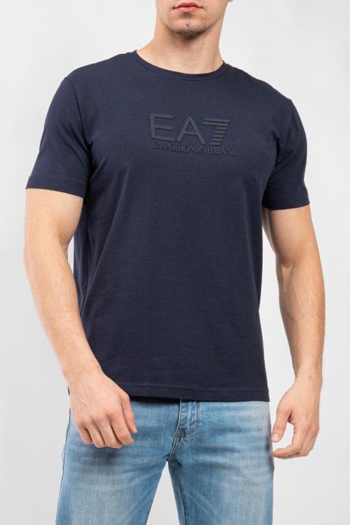 Мужская темно-синяя хлопковая футболка от EA7 Emporio Armani (ЕА7 Эмпорио Армани). Логотип на груди, круглый вырез горловины, короткий рукав, классическая длина.