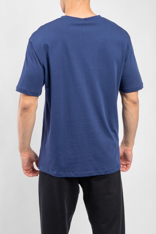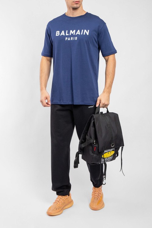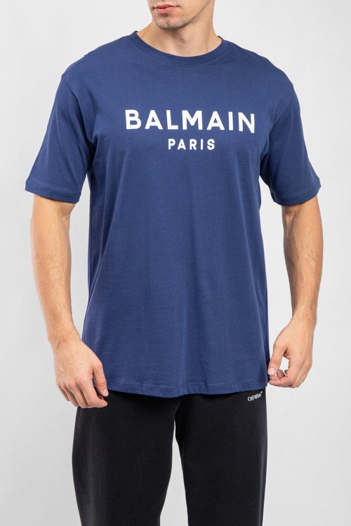 Мужская темно-синяя хлопковая футболка от Balmain (Бальман). Принт с логотипом на груди, круглый вырез горловины, короткий рукав, классическая длина.