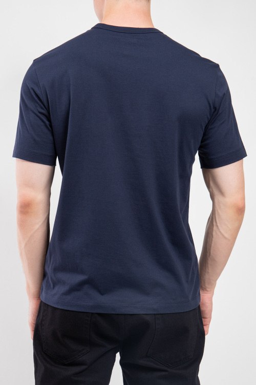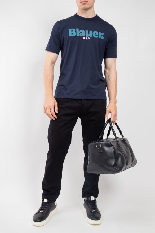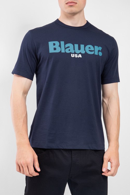 Детали: Мужская темно-синяя хлопковая футболка от Blauer (Блауэр). Принт с логотипом на груди, круглый вырез горловины, короткий рукав, классическая длина