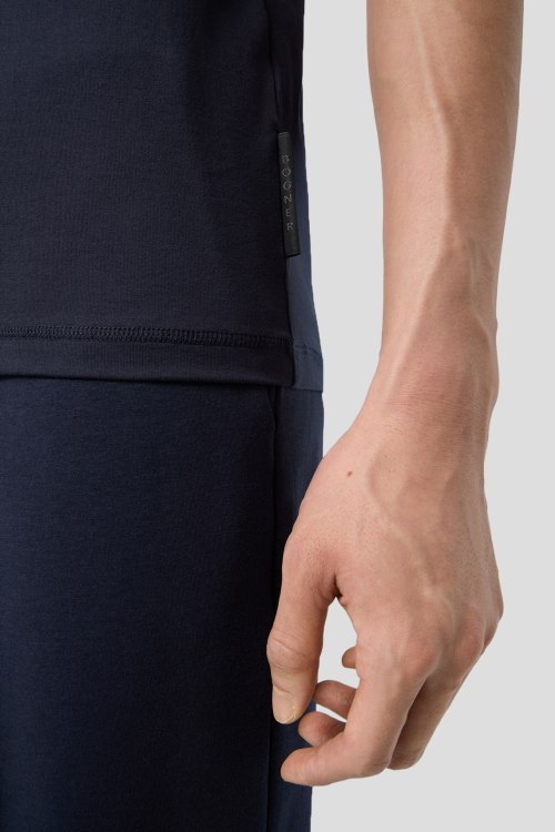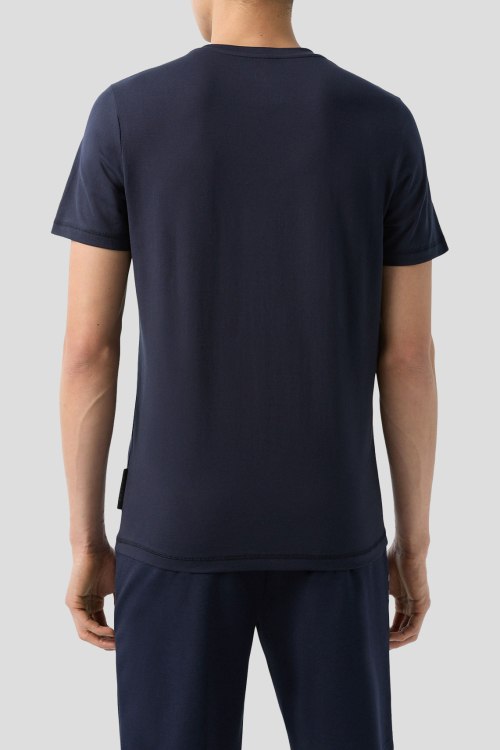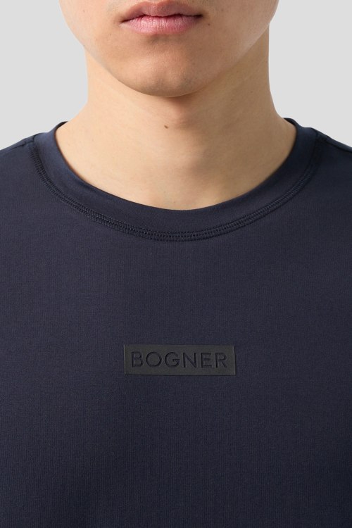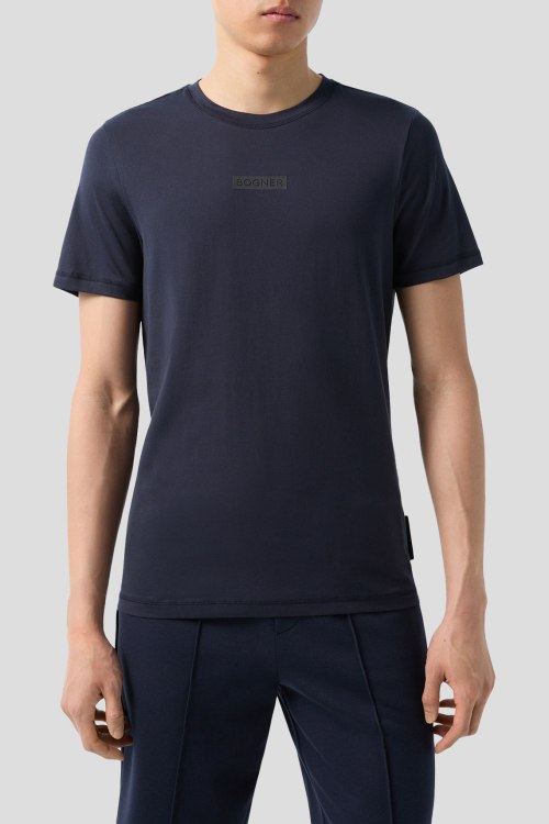Детали: Мужская темно-синяя хлопковая футболка Roc от Bogner (Богнер). Логотип на груди, круглый вырез горловины, короткий рукав, классическая длина