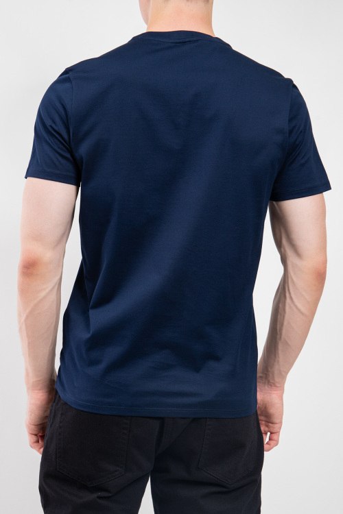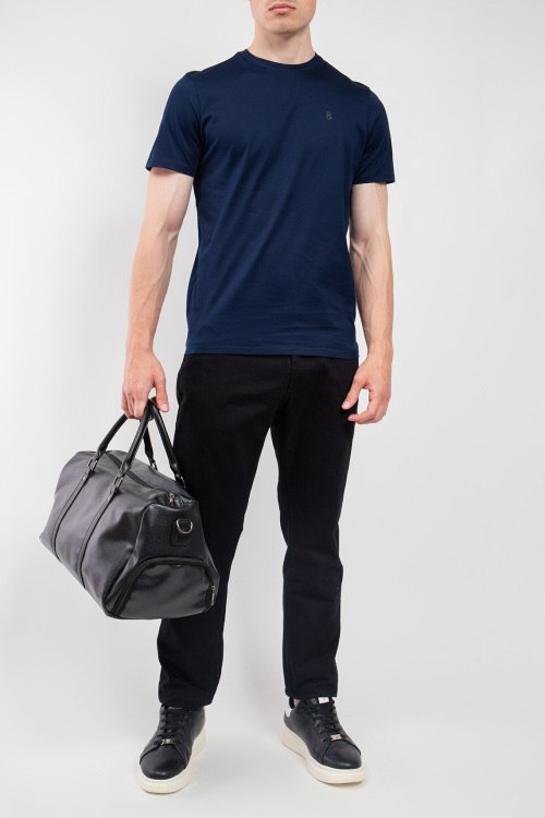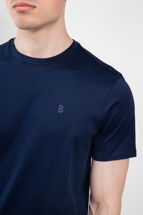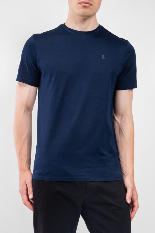 Детали: Мужская темно-синяя хлопковая футболка Aaron от Bogner (Богнер). Логотип на груди, круглый вырез горловины, короткий рукав, классическая длина