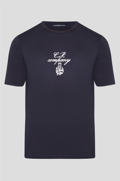 Детали: Мужская темно-синяя футболка из хлопка от C.P. Company (СиПи Компани). Классическая длина, круглый вырез горловины, короткие рукава, вышитый логотип бренда на груди. Замеры: длина рукава: короткий, для размера М - 25,5 см, обхват груди: для размера М - 112 см, обхват талии: для размера М - 108 см, длина изделия по среднему шву спинки от горловины: для размера М - 70 см