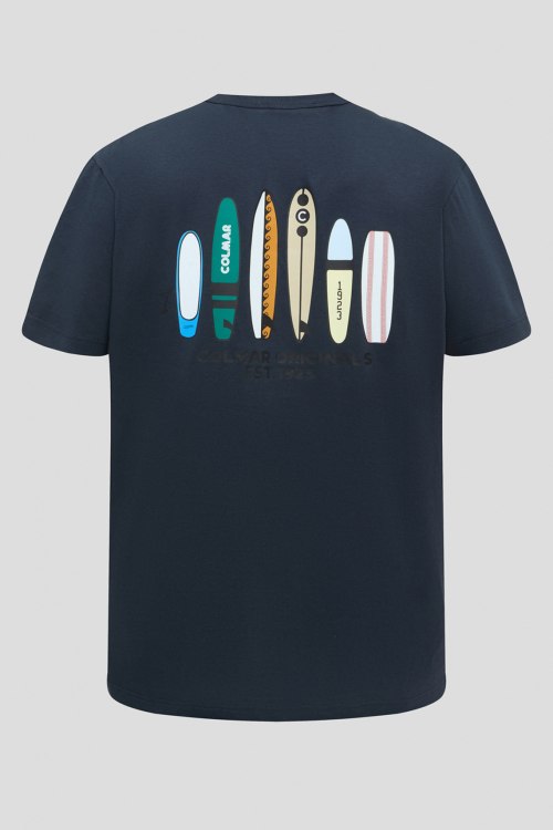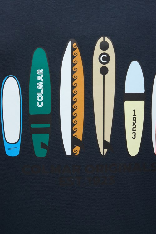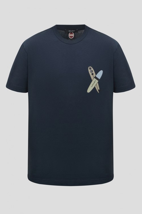 Детали: Мужская темно-синяя футболка из хлопка от Colmar (Колмар). Классическая длина, круглый вырез горловины, короткие рукава, модель декорирована принтом. Замеры: длина рукава: короткий, для размера M - 22 см, обхват груди: для размера M - 106 см, обхват талии: для размера M - 100 см, длина изделия по среднему шву спинки от горловины: для размера M - 66 см