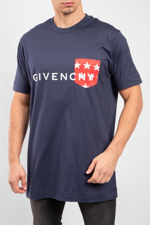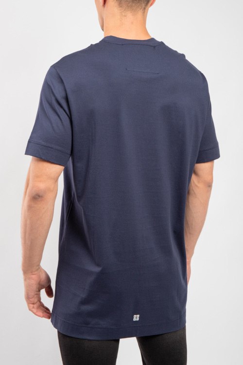 Мужская темно-синяя хлопковая футболка от Givenchy (Живанши). Фасон oversize, логотип на груди, круглый вырез горловины, короткий рукав, удлиненная длина.