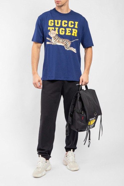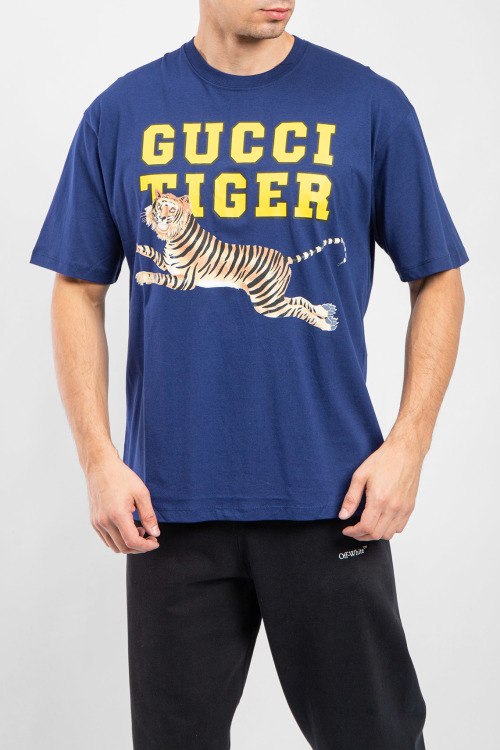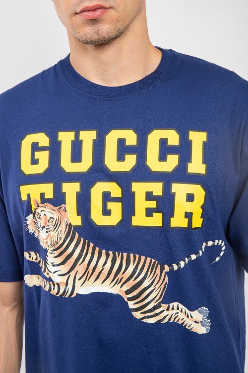Мужская темно-синяя хлопковая футболка Gucci Tiger от Gucci (Гуччи). Логотип на груди, круглый вырез горловины, короткий рукав, удлиненная длина.
