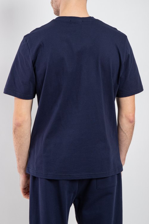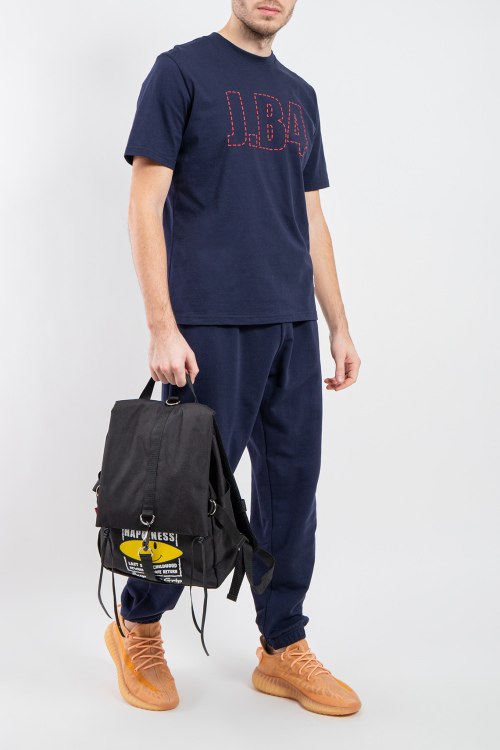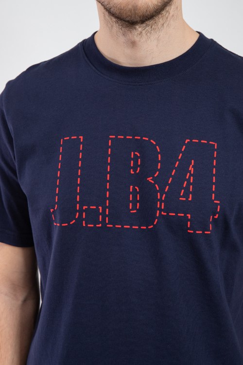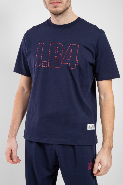 Мужская темно-синяя хлопковая футболка от J.B4 Just Before (Джаст Бифо). Принт с логотипом на груди, круглый вырез горловины, короткий рукав, классическая длина.