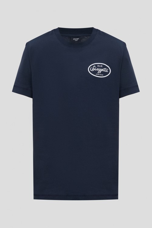 Детали: Мужская темно-синяя футболка их хлопка от Joop! (Йооп!). Прямой крой, круглый вырез горловины, контрастный принт на груди и спине. Замеры: длина рукава: короткий, для размера М - 22,5 см, обхват груди: для размера М - 116 см, обхват талии: для размера М - 110 см, длина изделия по среднему шву спинки от горловины: для размера М - 67 см