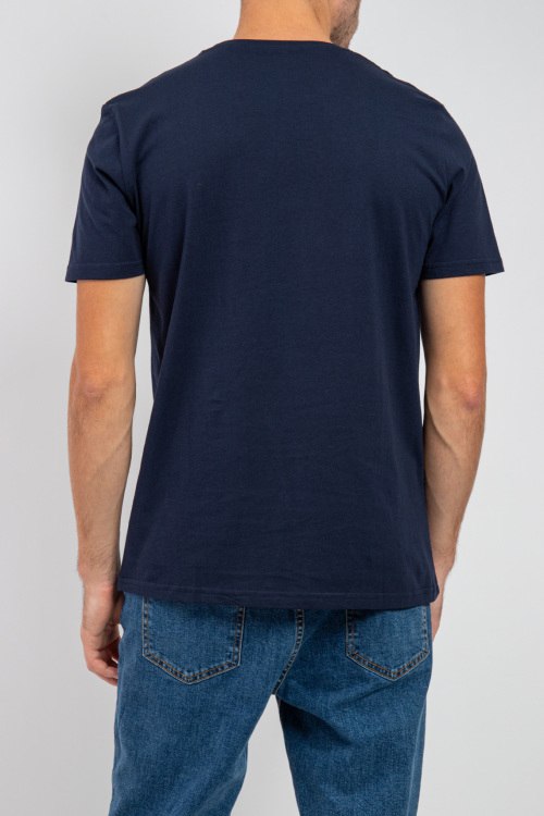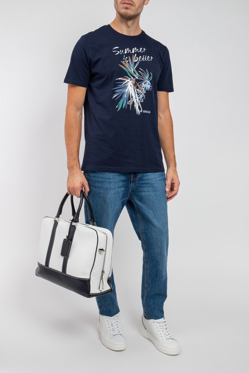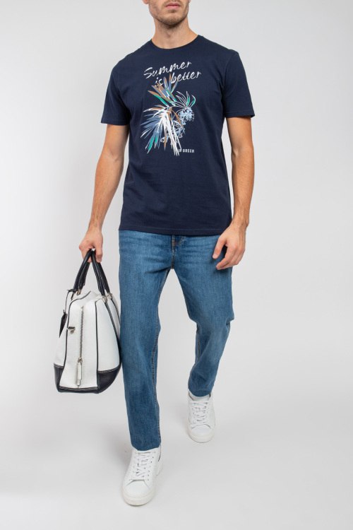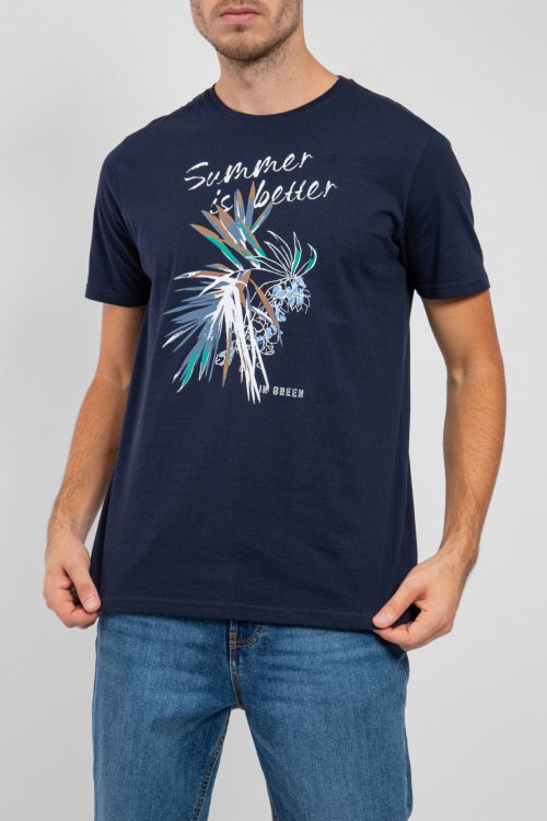 Мужская темно-синяя хлопковая футболка Summer Time от Marvelis (Марвелис). Принт на груди, круглый вырез горловины, короткий рукав, классическая длина. Замеры для размера L: длина 74 см, полу обхват груди 55 см, длина рукава 23 см.