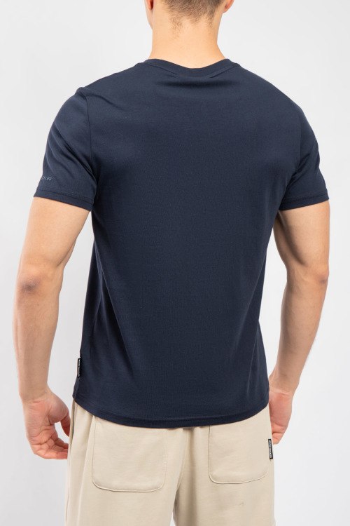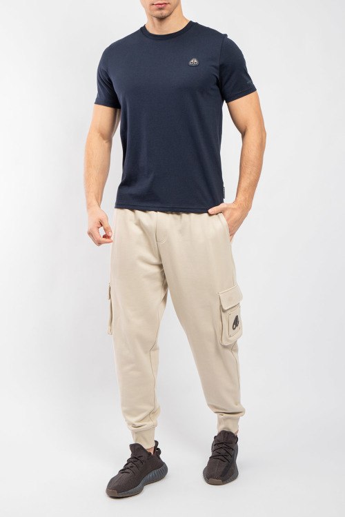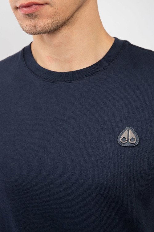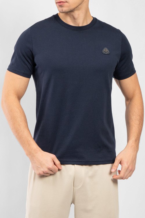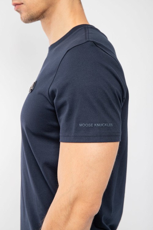 Детали: Мужская темно-синяя хлопковая футболка от Moose Knuckles (Мус Наклс). Логотип на груди, круглый вырез горловины, короткий рукав, классическая длина. Размер вещи на фото: M