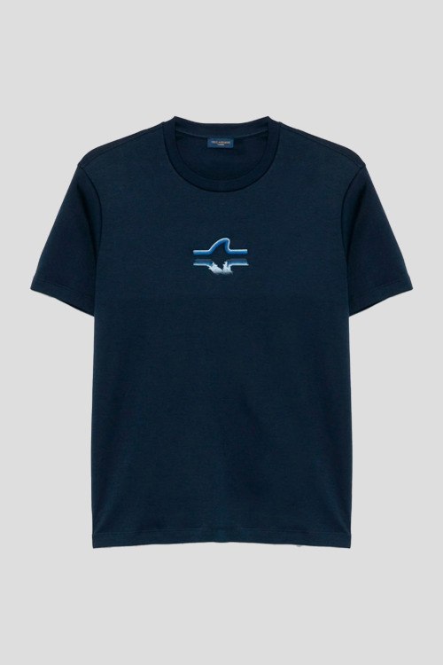 Детали: Мужская темно-синяя хлопковая футболка от Paul & Shark (Пол энд Шарк). Принт на груди, круглый вырез горловины, короткий рукав, классическая длина