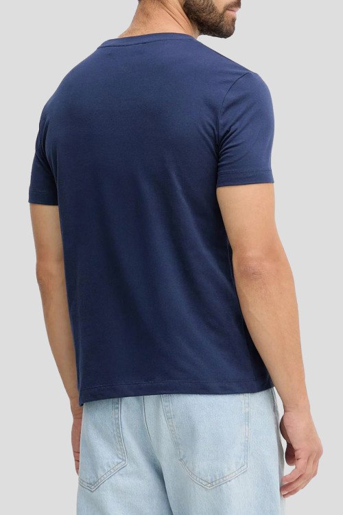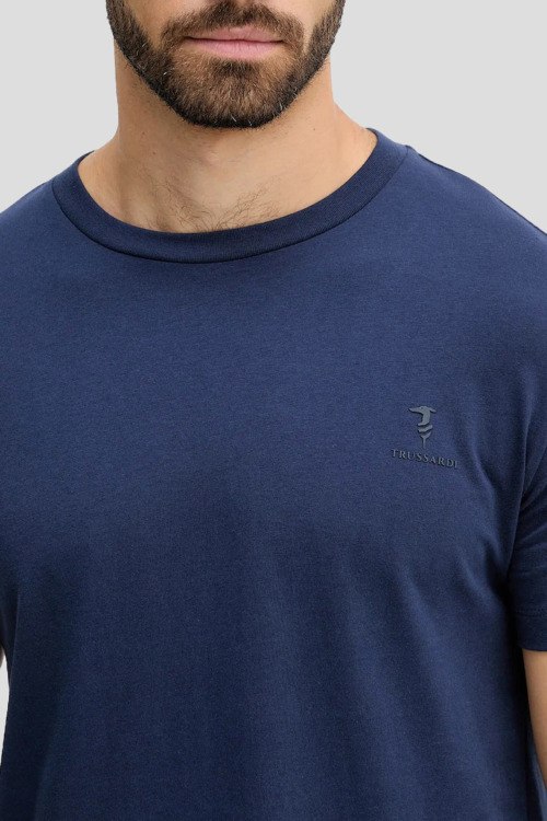 Детали: Мужская темно-синяя хлопковая футболка от Trussardi (Труссарди). Логотип на груди, круглый вырез горловины, короткий рукав, классическая длина