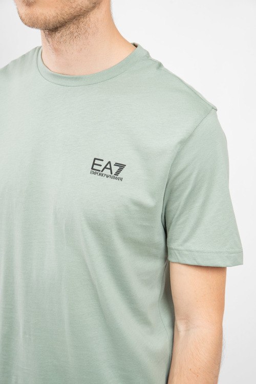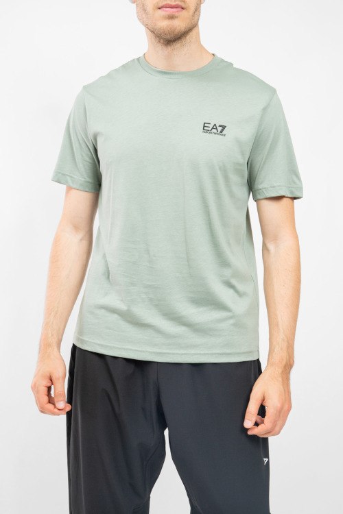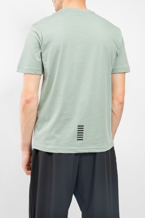 Мужская зеленая футболка из хлопка от EA7 Emporio Armani (ЕА7 Эмпорио Армани). Классическая длина, круглый вырез горловины, короткие рукава, логотип бренда на груди.