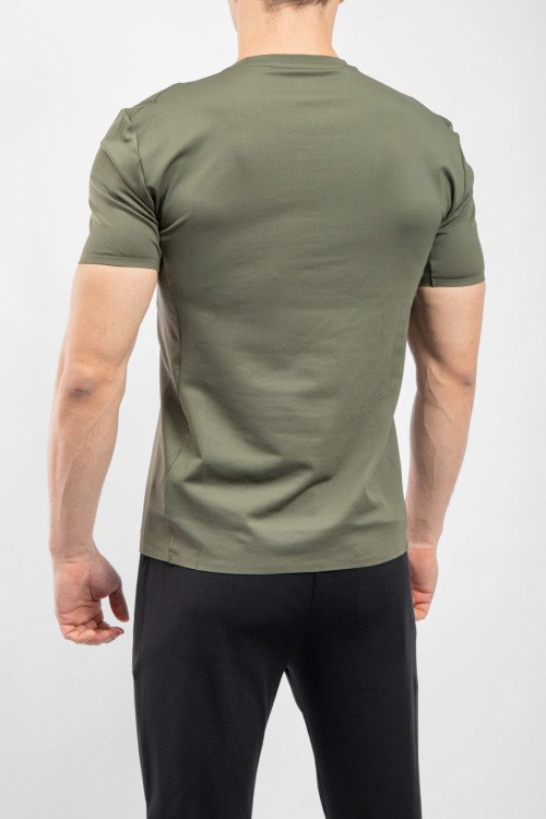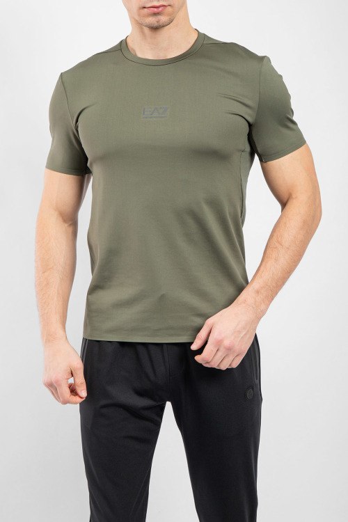 Мужская зеленая футболка из полиэстера от EA7 Emporio Armani (ЕА7 Эмпорио Армани). Классическая длина, круглый вырез горловины, короткие рукава, логотип бренда на груди.