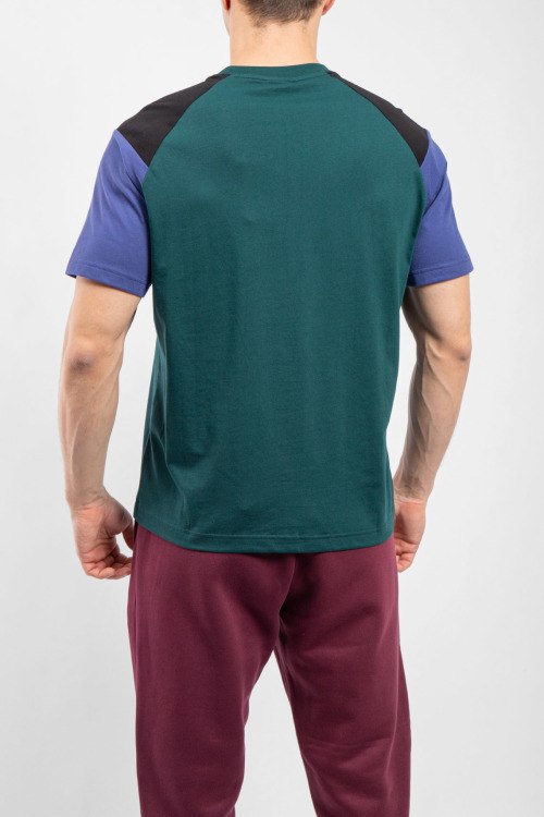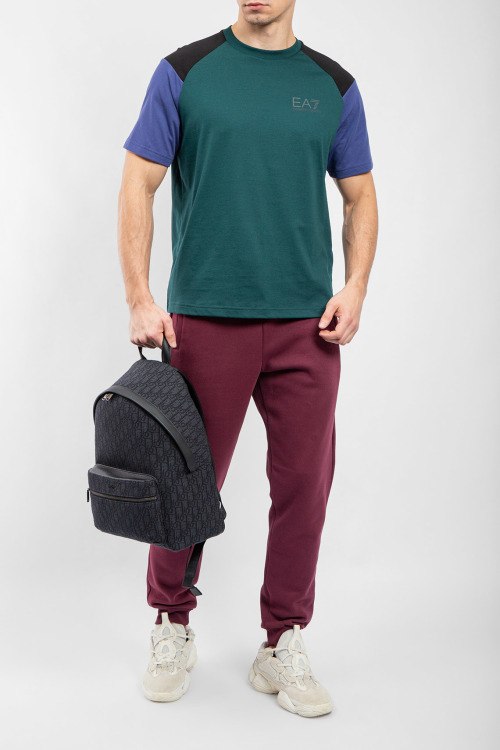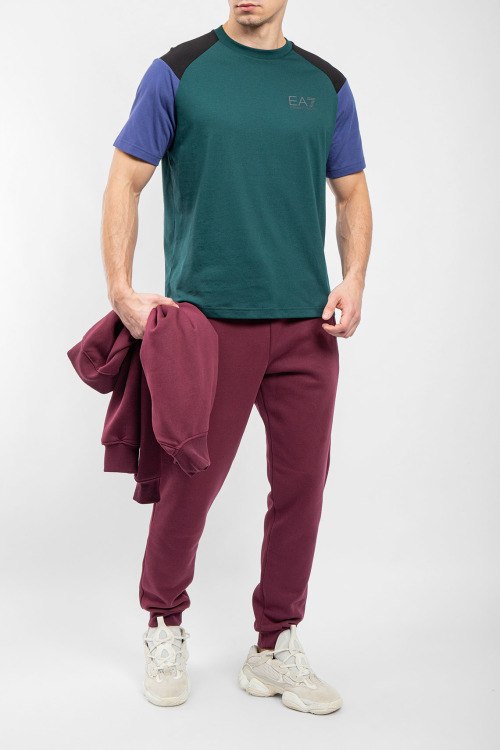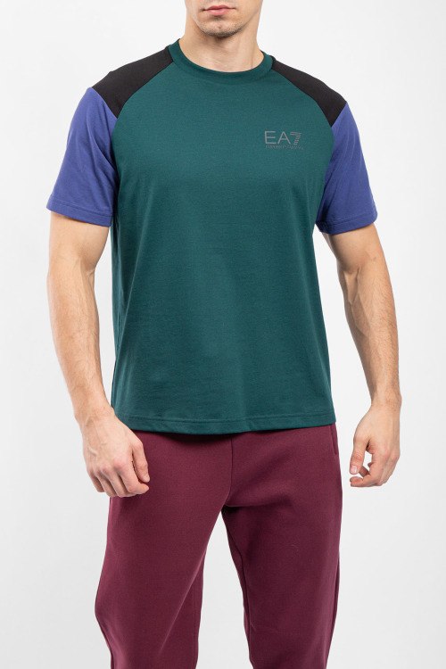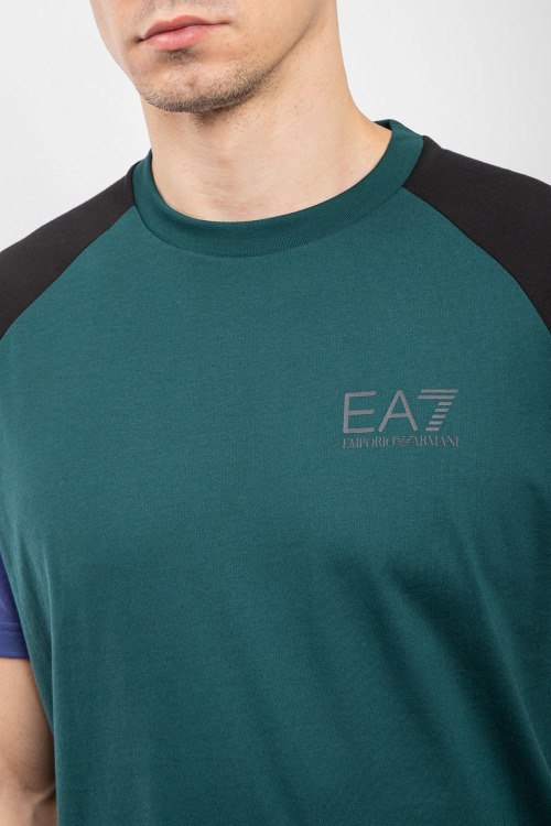Мужская зеленая футболка из полиэстера от EA7 Emporio Armani (ЕА7 Эмпорио Армани). Классическая длина, комбинированные вставки, круглый вырез горловины, короткие рукава, логотип бренда на груди.