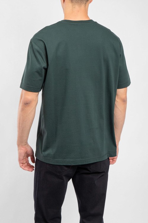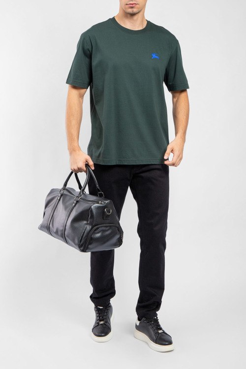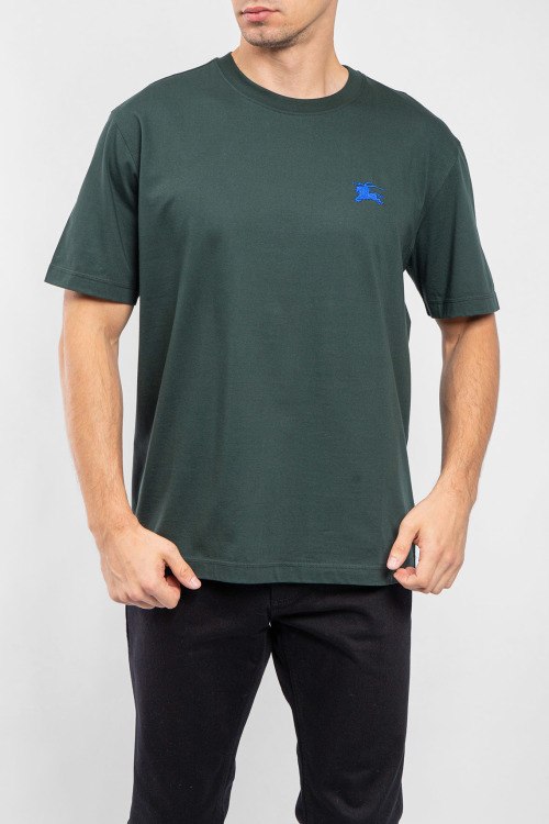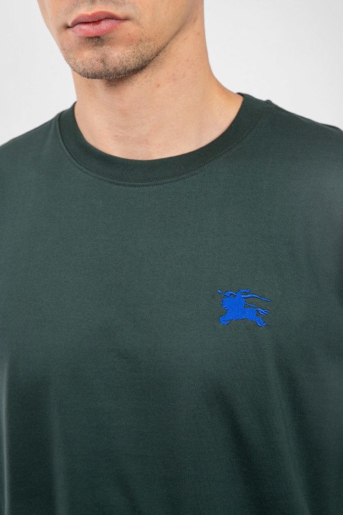Мужская темно-зеленая хлопковая футболка от Burberry (Бёрберри). Брендовая вышивка EKD на груди, круглый вырез горловины, короткий рукав, классическая длина.