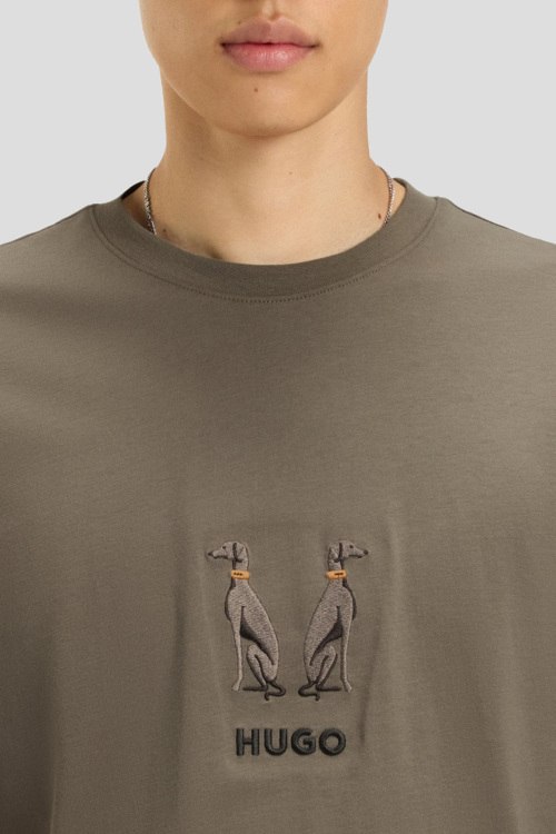 Детали: Мужская оливковая хлопковая футболка Dugolini от Hugo by Hugo Boss (Хуго бай Хуго Босс). Вышивка на груди, круглый вырез горловины, короткий рукав, классическая длина