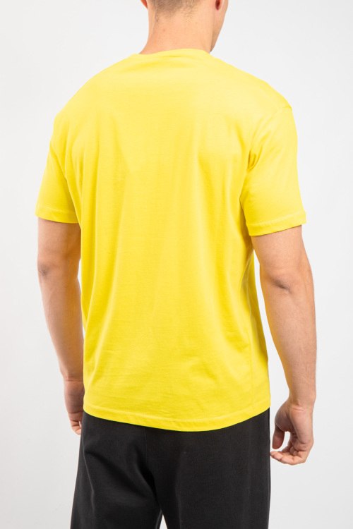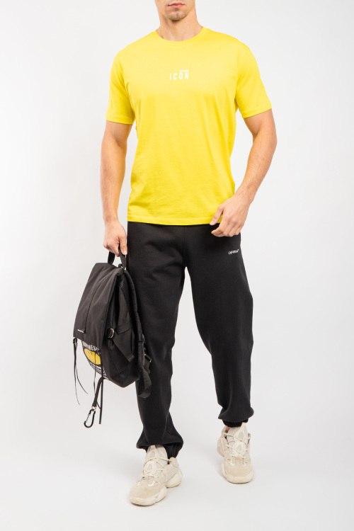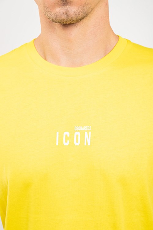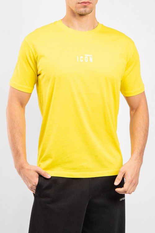 Мужская желтая хлопковая футболка ICON от Dsquared2 (Дискваред). Принт с логотипом на груди, круглый вырез горловины, короткий рукав, классическая длина.