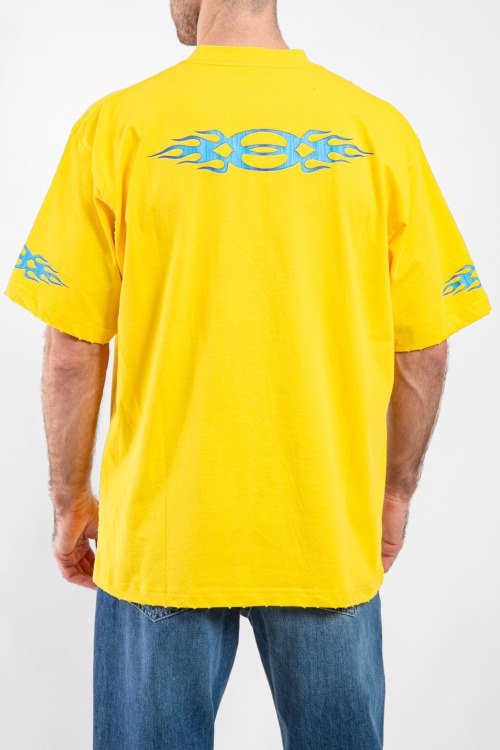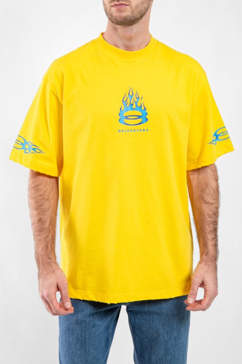 Детали: Мужская желтая футболка из хлопка от Balenciaga (Баленсиага). Круглый вырез горловины, короткие рукава, приспущенная линия плеча, модель декорирована графическим принтом на груди, спине и на рукавах