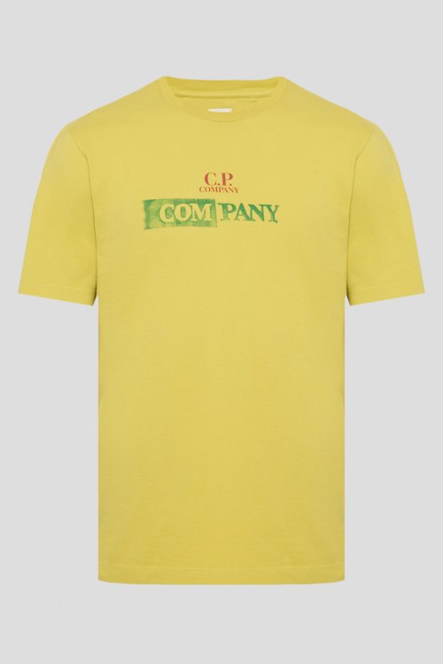 Детали: Мужская желтая футболка из хлопка от C.P. Company (СиПи Компани). Классическая длина, круглый вырез горловины, короткие рукава, двусторонний принт с логотипом бренда. Замеры: длина рукава: короткий, для размера М - 24 см, обхват груди: для размера М - 106 см, обхват талии: для размера М - 106 см, длина изделия по среднему шву спинки от горловины: для размера М - 68 см