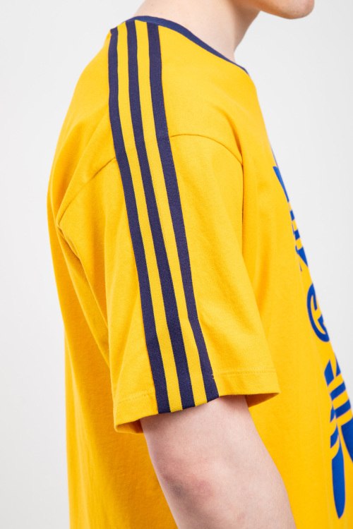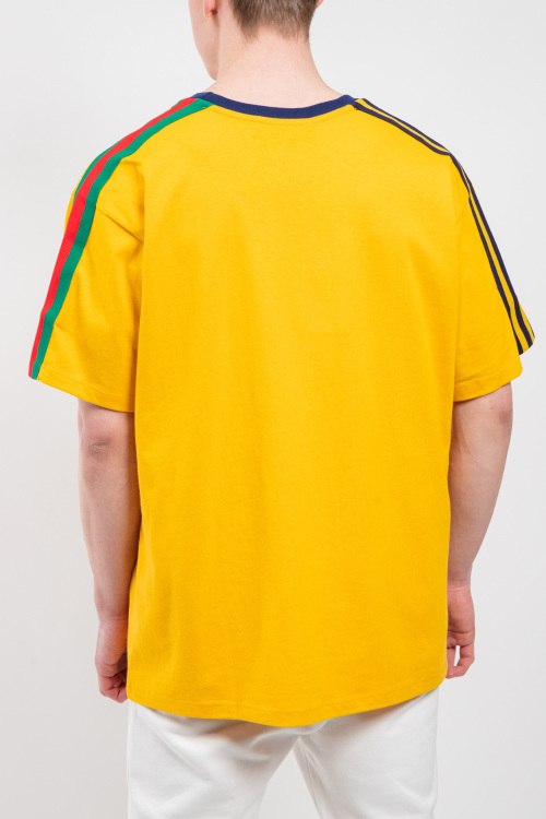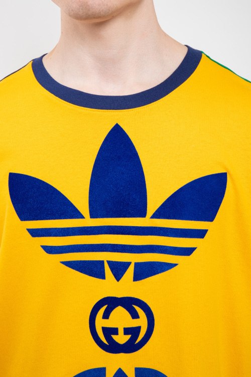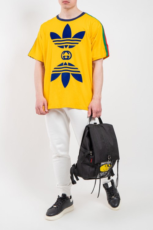 Мужская желтая футболка из хлопка от Gucci (Гуччи). Модель из коллаборации Gucci X Adidas, дизайн с принтом, логотип бренда, круглый вырез горловины, короткие рукава.
