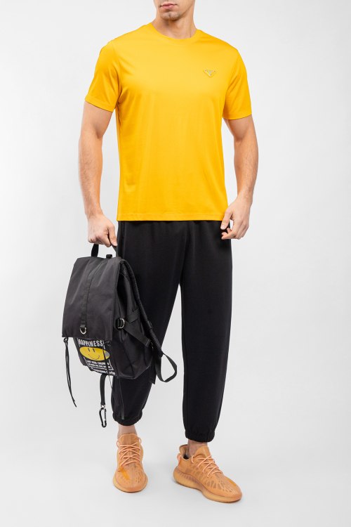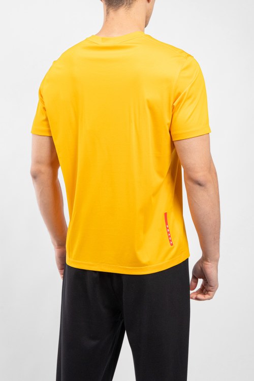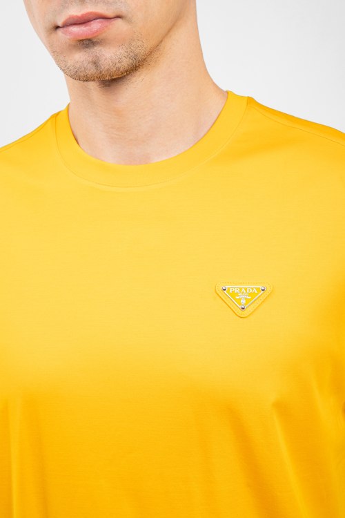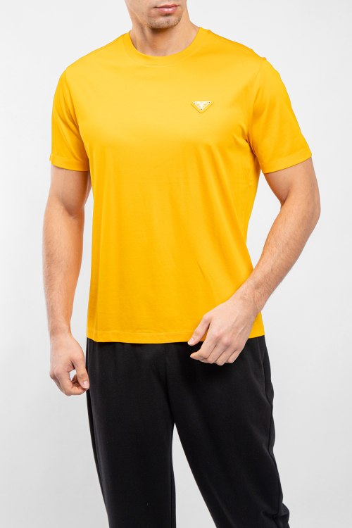Мужская желтая хлопковая футболка от Prada (Прада). Логотип на груди, круглый вырез горловины, короткий рукав, классическая длина.