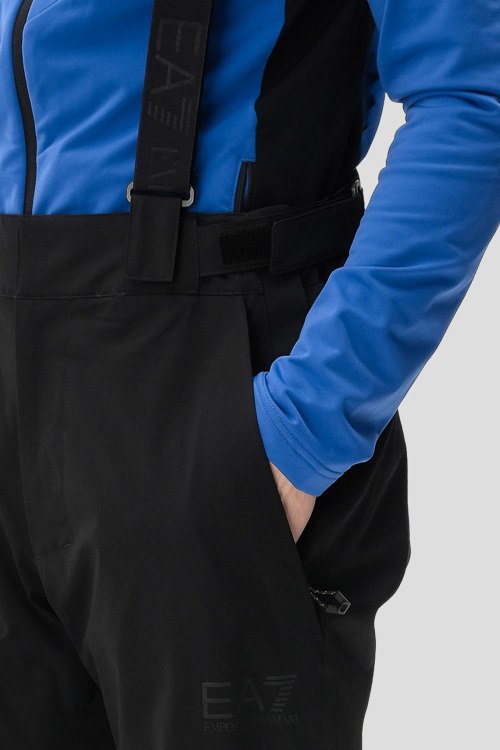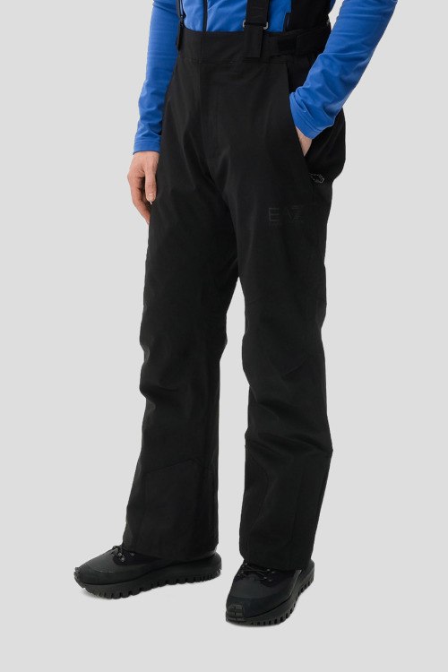 Детали: Мужские черные лыжные брюки из полиамида и эластана от EA7 Emporio Armani (ЕА7 Эмпорио Армани). Водоотталкивающая и воздухопроницаемая модель, проклеенные швы по всей длине, регулируемая талия, два боковых кармана, регулируемые эластичные бретели с логотипом