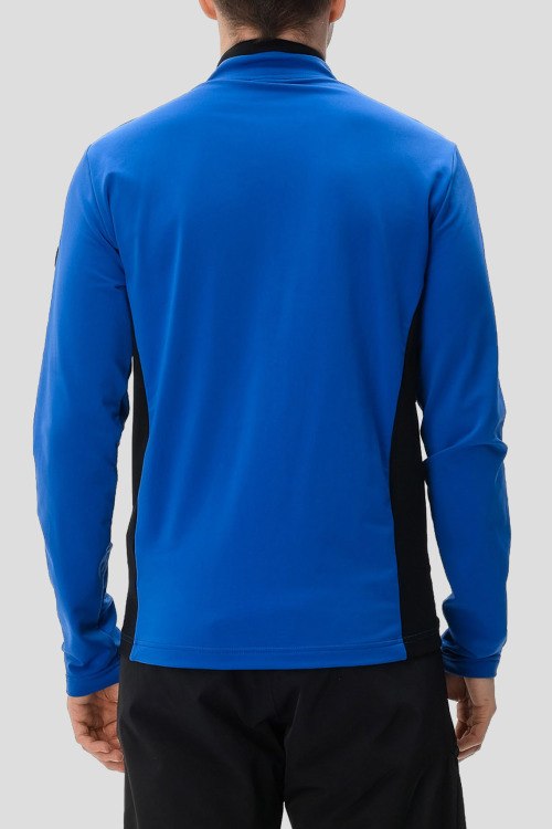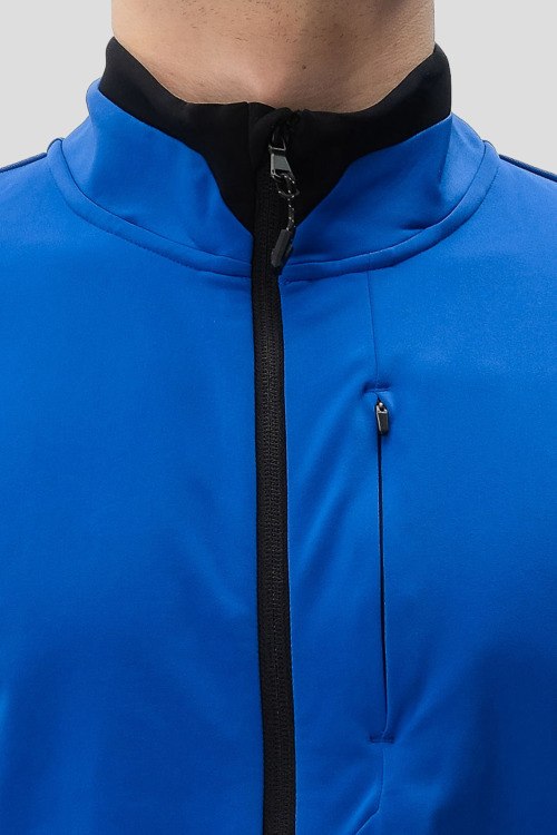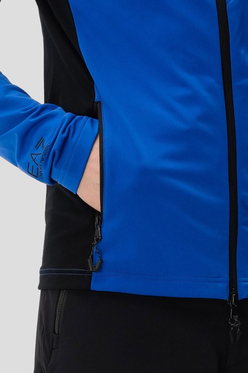 Детали: Мужская синяя лыжная спортивная кофта из полиэстера от EA7 Emporio Armani (ЕА7 Эмпорио Армани). Дышащий материал, высокий воротник-стойка, застежка на молнию, длинные рукава, прорезные карманы на молнии, патч-лого
