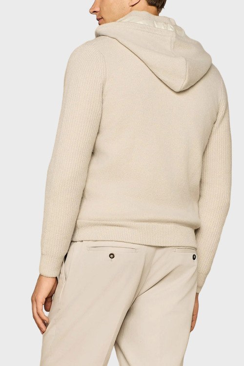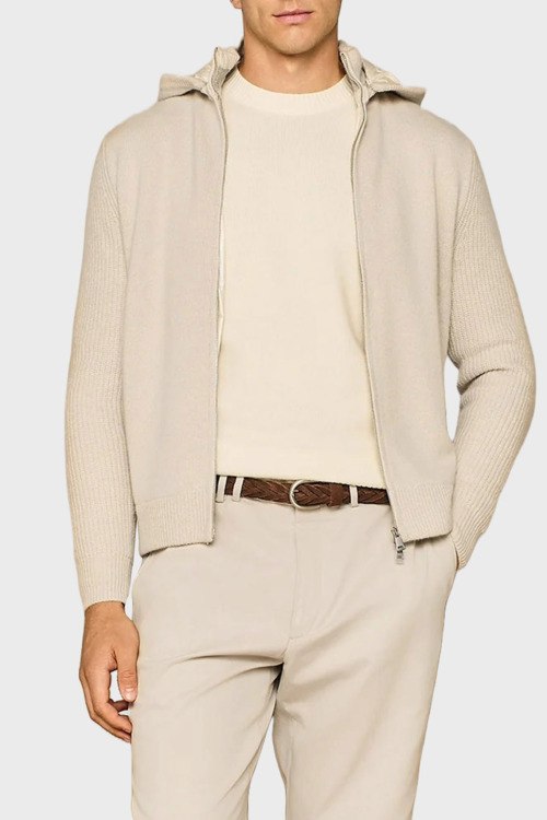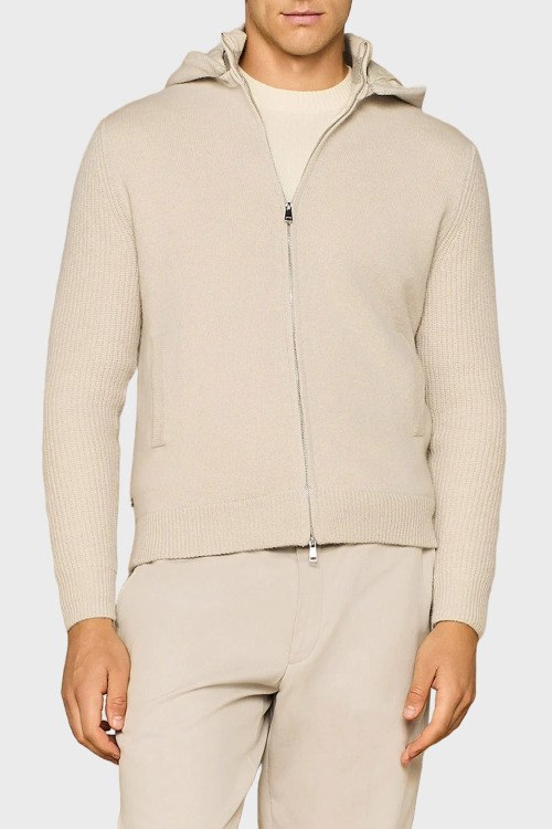 Детали: Мужской бежевый кардиган из шерсти и кашемира от Paul Taylor (Пол Тейлор). Высокий воротник, съемный капюшон, боковые карманы, застежка-молния, классическая длина
