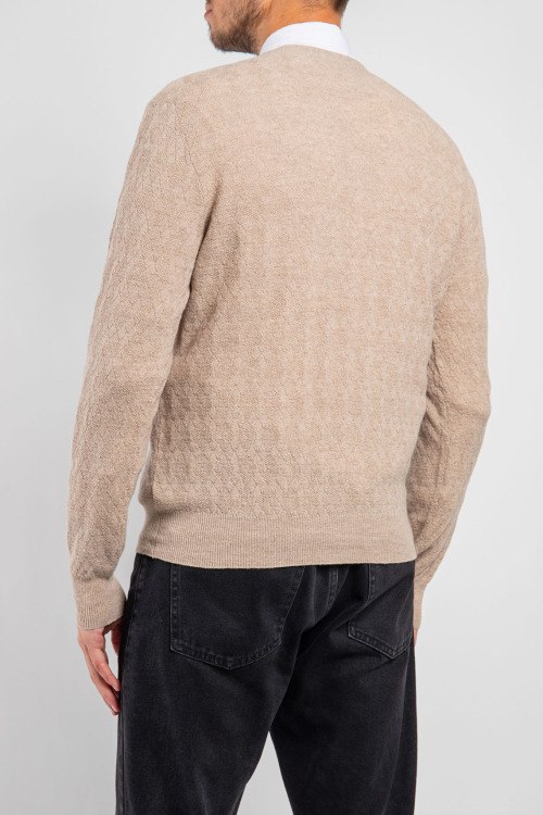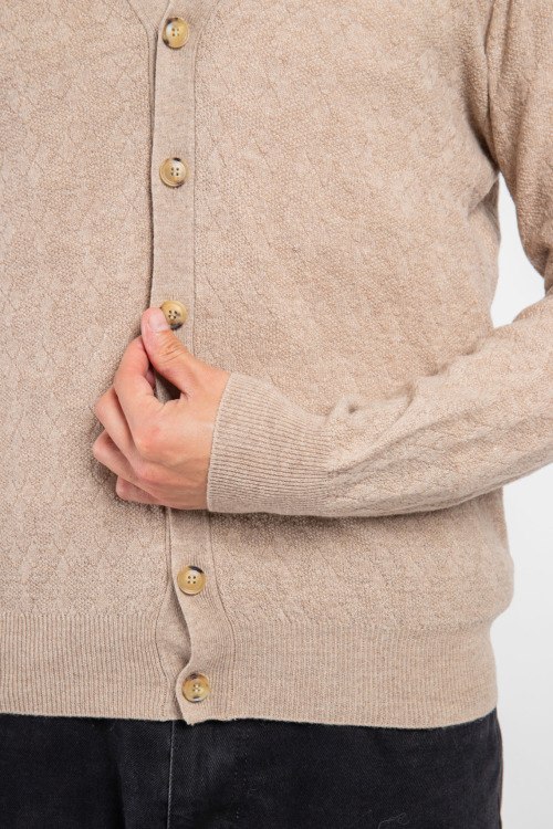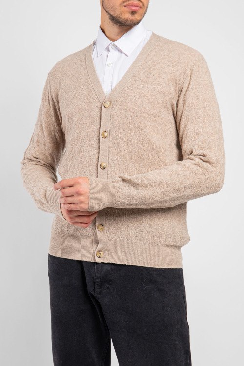 Детали: Мужской бежевый кардиган из шерстяного микса от Piacenza Cashmere (Пьяченца Кашемир). Классическая длина, длинные рукава, V-образный вырез горловины, застежка на пуговицы, трикотажная резинка на манжетах и по низу изделия. Модель с парфюмированной пропиткой