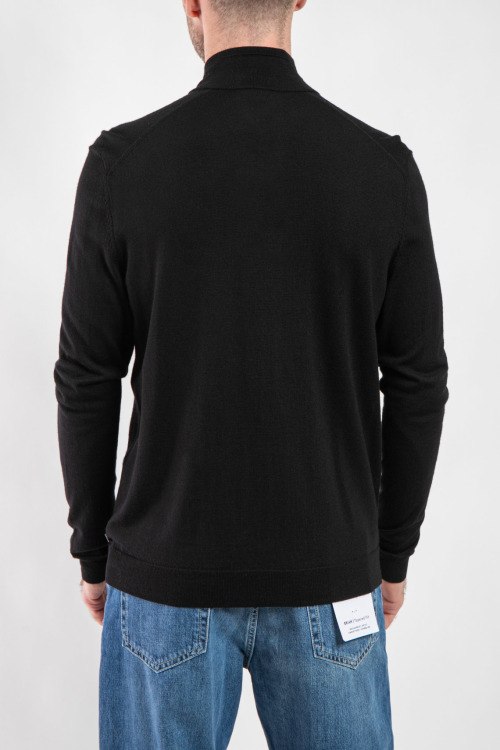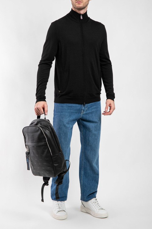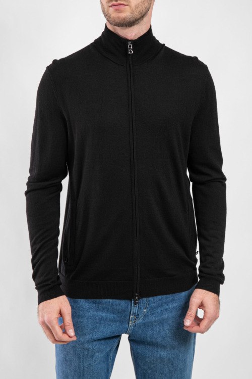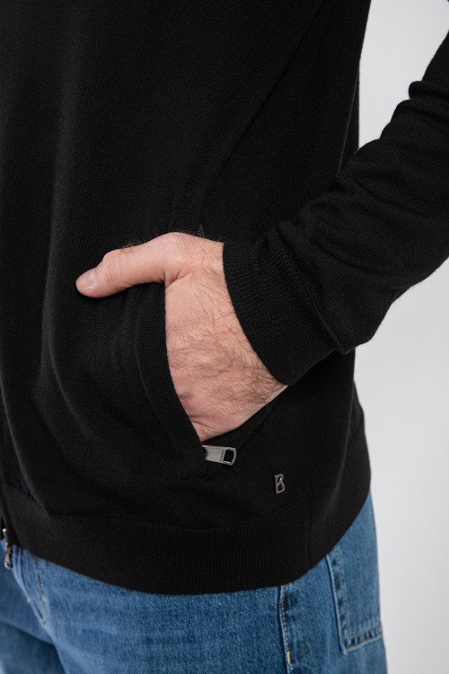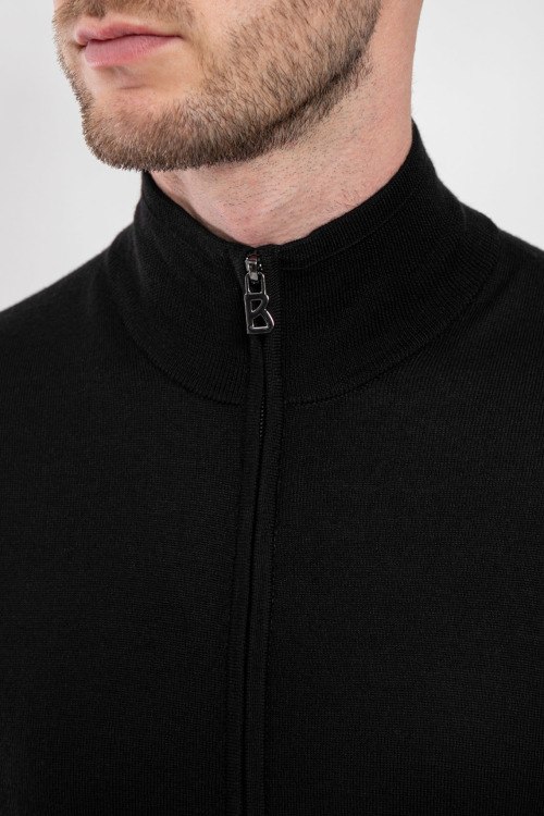 Мужской черный кардиган Oscar Knit из натуральной шерсти от Bogner (Богнер). Высокий воротник-стойка, застежка на молнию, длинные рукава, прорезные карманы на молнии.