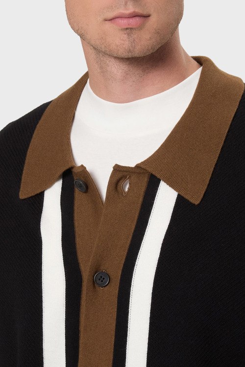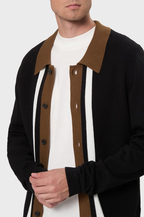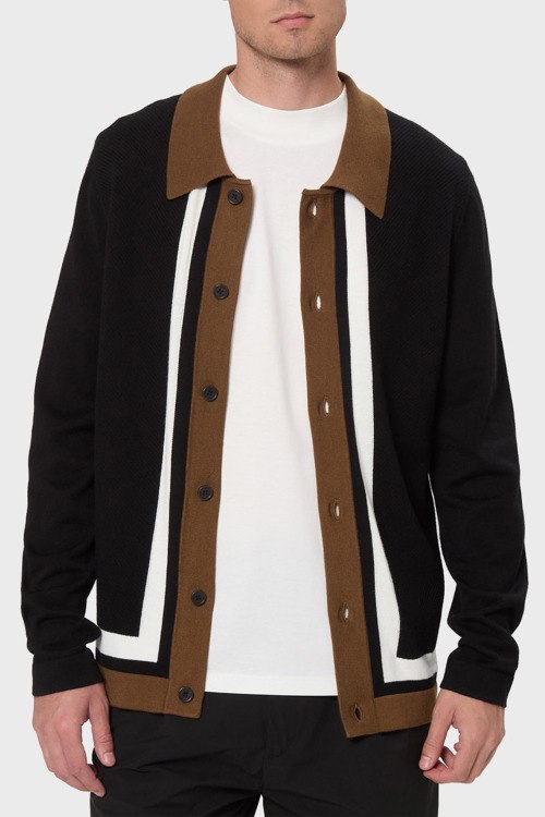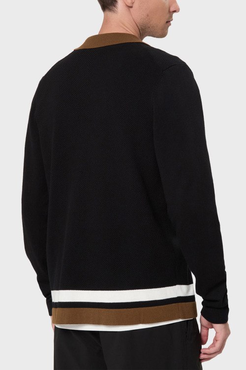 Детали: Мужской черный трикотажный кардиган Splon от Hugo by Hugo Boss (Хуго бай Хуго Босс). Контрастные элементы, отложной воротник, застежка на пуговицы, классическая длина