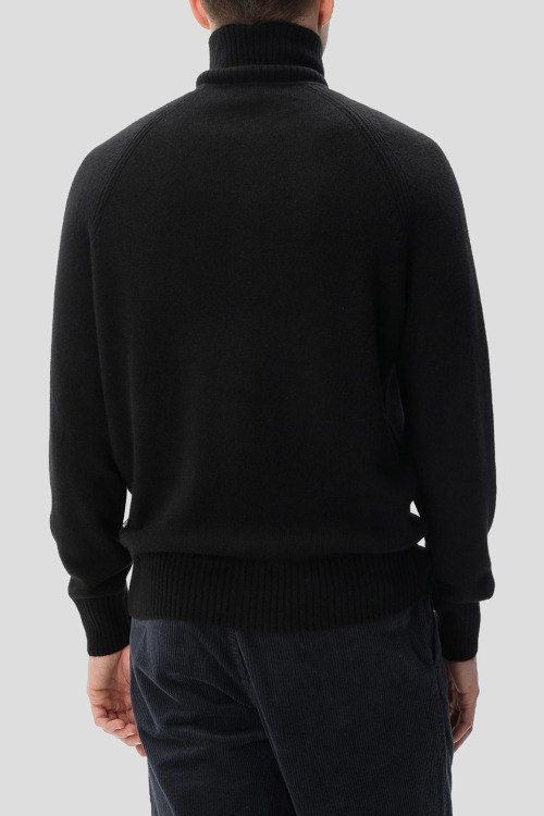 Детали: Мужской черный кардиган из кашемира от Hugo Boss (Хуго Босс). Высокий воротник-стойка, застежка на молнию, длинные рукава, манжеты и низ изделия в рубчик