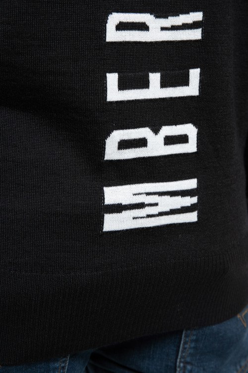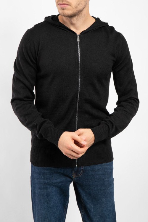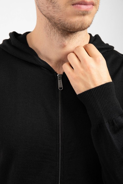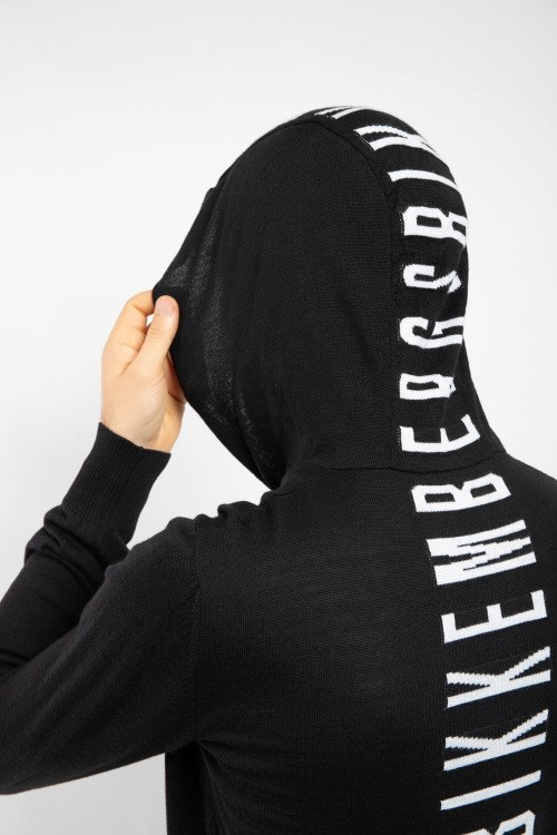 Мужской черный кардиган из шерстяного микса от Bikkembergs (Биккембергс). Вшитый капюшон, застежка на молнию, манжеты и низ изделия в рубчик, брендированный принт на спине.