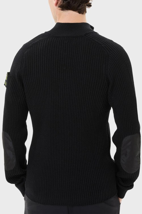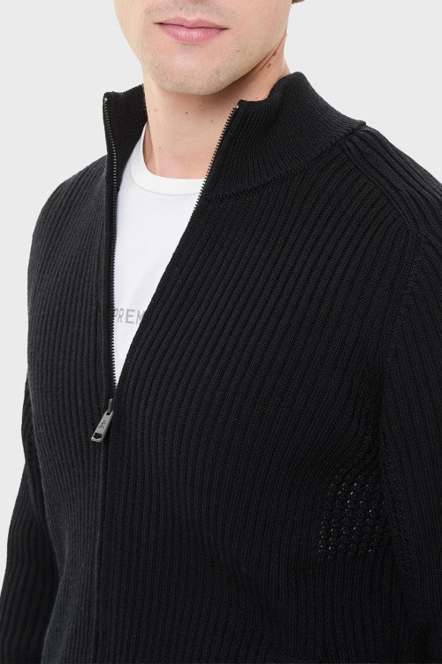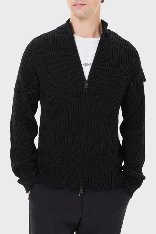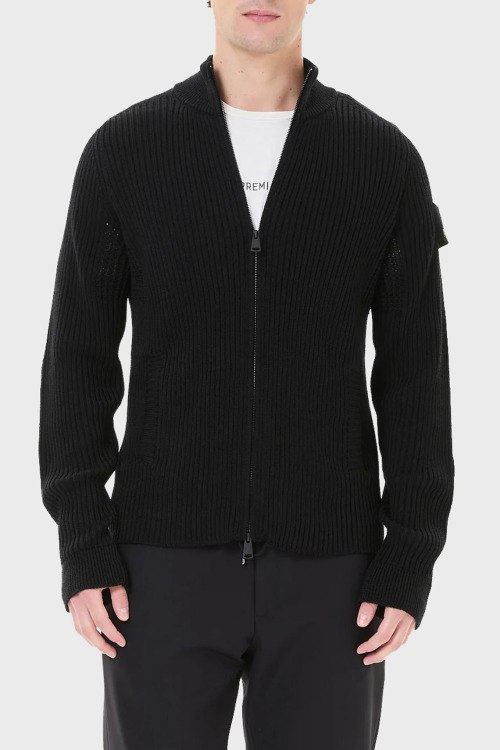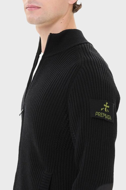Детали: Мужской черный кардиган из шерсти от Premiata (Премиата). Классическая длина, высокий воротник-стойка, застежка на молнию, патч-лого, длинные рукава-реглан, усиленные накладки на локтях