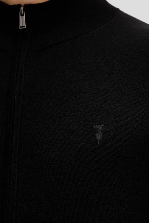 Детали: Мужской черный трикотажный кардиган от Trussardi (Труссарди). Логотип на груди, воротник-стойка, застежка-молния, классическая длина