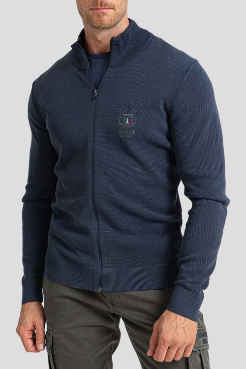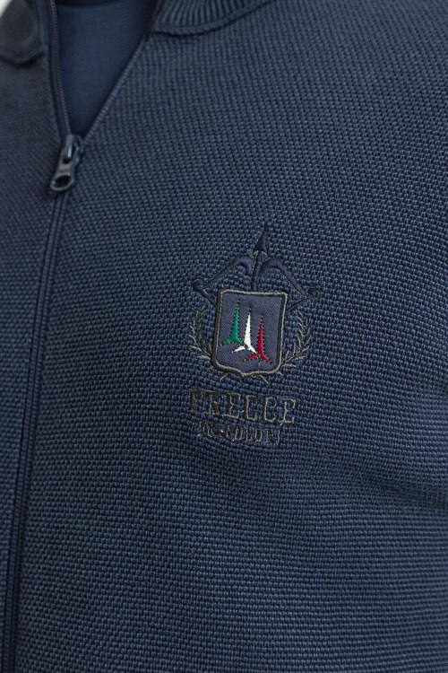 Детали: Мужской темно-синий кардиган Frecce Tricolori из хлопка и лиоцелла от Aeronautica Militare (Аэронавтика Милитари). Классическая длина, высокий воротник-стойка, застежка на молнию, вышивка на груди, трикотажная резинка на манжетах и по низу изделия