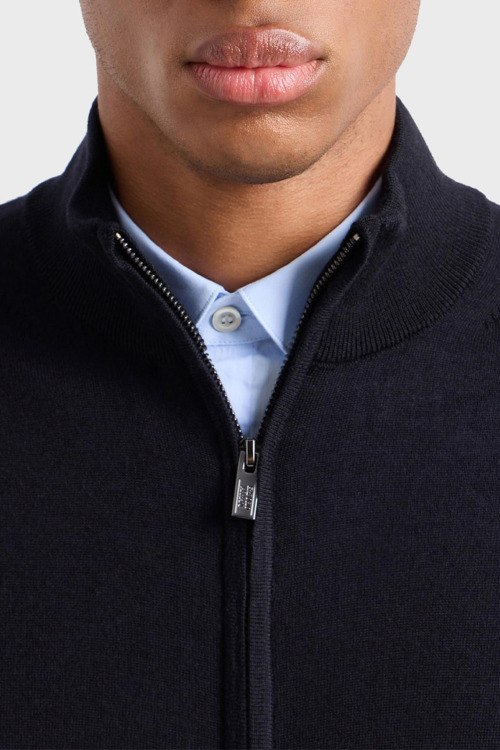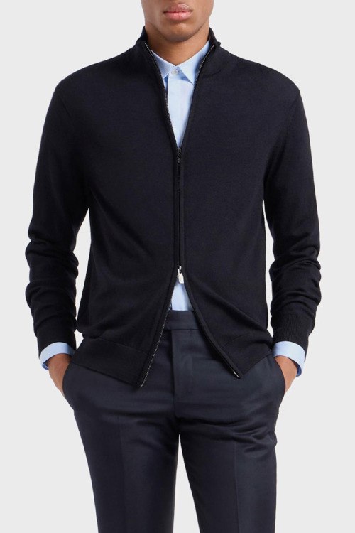 Детали: Мужской темно-синий шерстяной кардиган от Emporio Armani (Эмпорио Армани). Воротник-стойка, застежка-молния, классическая длина, ребристые манжеты и нижний край