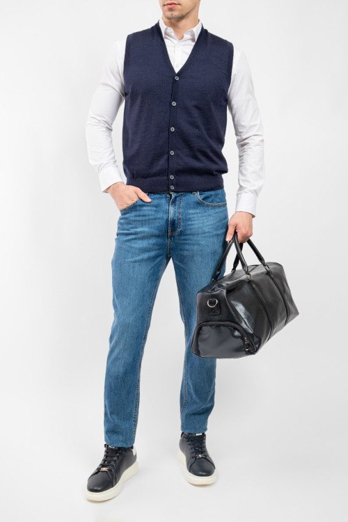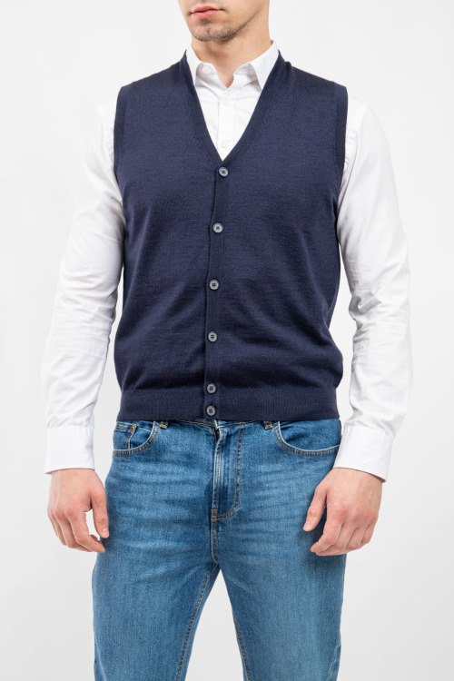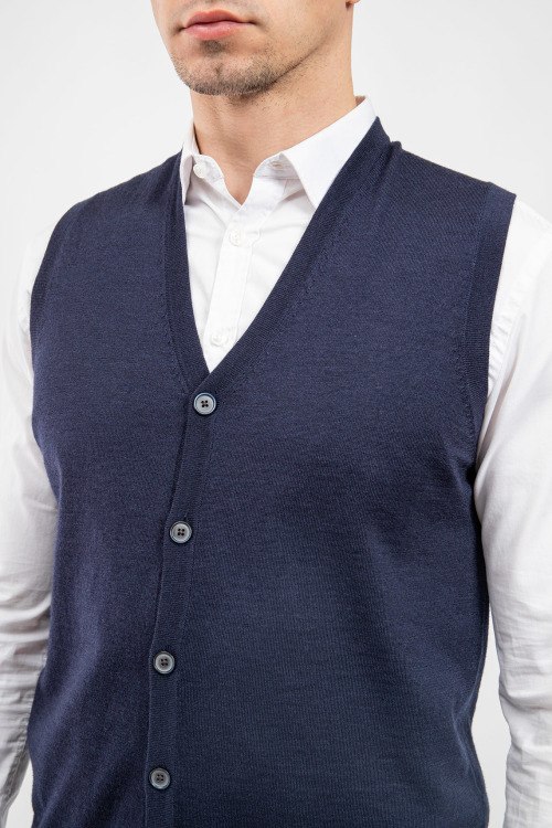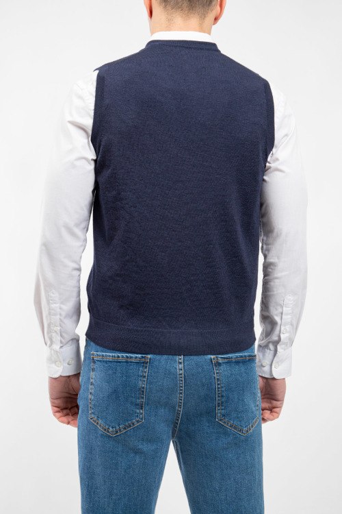 Детали: Мужской темно-синий жилет из шерсти от Olymp (Олимп). Классическая длина, застежка на пуговицы, без рукавов, трикотажная резинка по низу изделия