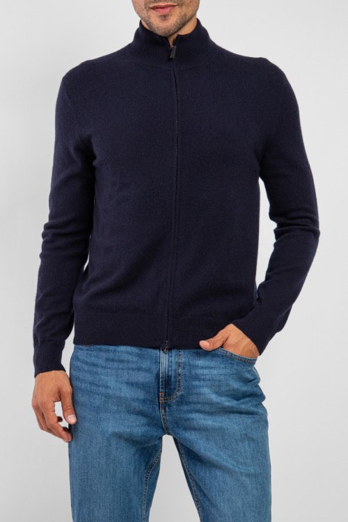 Мужской темно-синий кашемировый кардиган от Scabal (Скабал). Воротник-стойка, застежка-молния, классическая длина, манжеты и нижний край в рубчик.