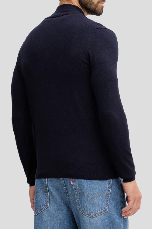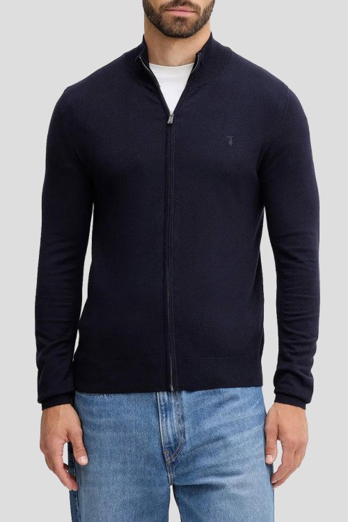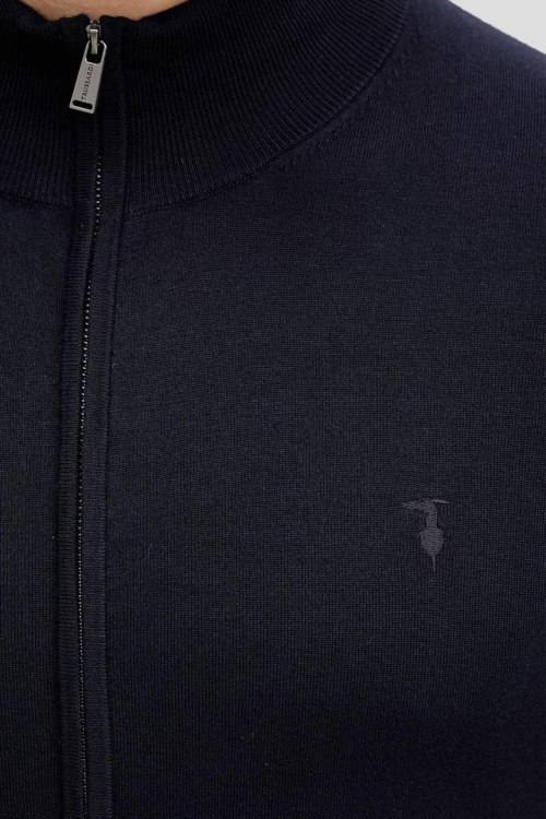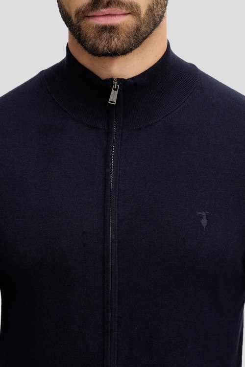 Детали: Мужской темно-синий трикотажный кардиган от Trussardi (Труссарди). Логотип на груди, воротник-стойка, застежка-молния, классическая длина