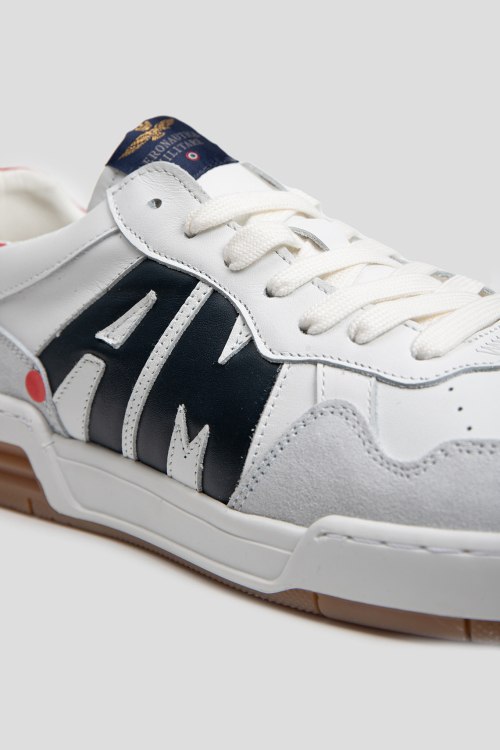 Детали: Мужские белые кеды из натуральной кожи и замши от Aeronautica Militare (Аэронавтика Милитари). Закругленный носок с перфорацией, комбинация материалов и цветов, спереди шнуровка, рельефная подошва