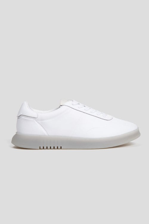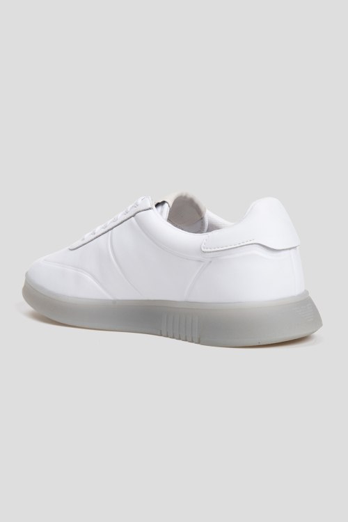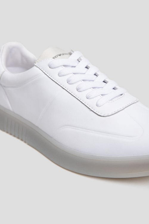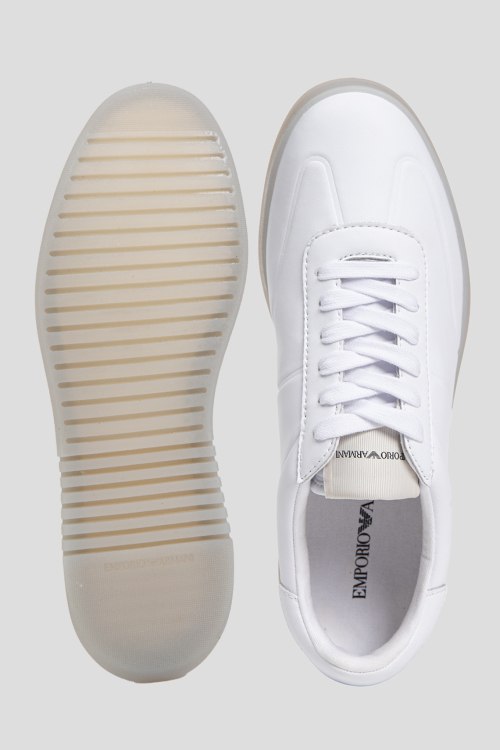 Детали: Мужские белые кеды из экокожи от Armani (Армани). Закругленный носок, спереди шнуровка, логотип бренда, рельефная подошва