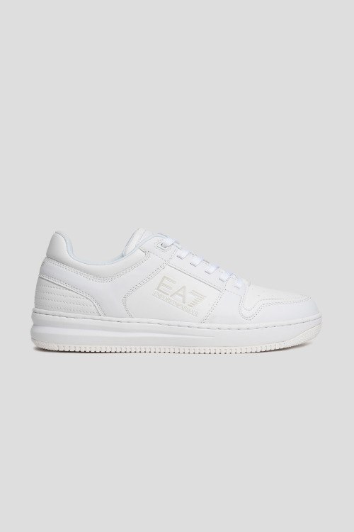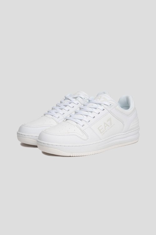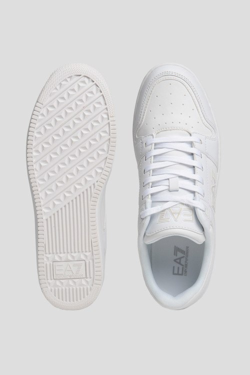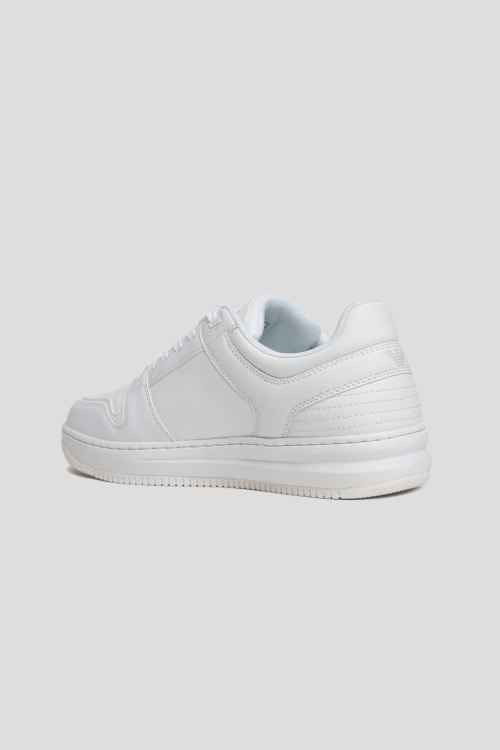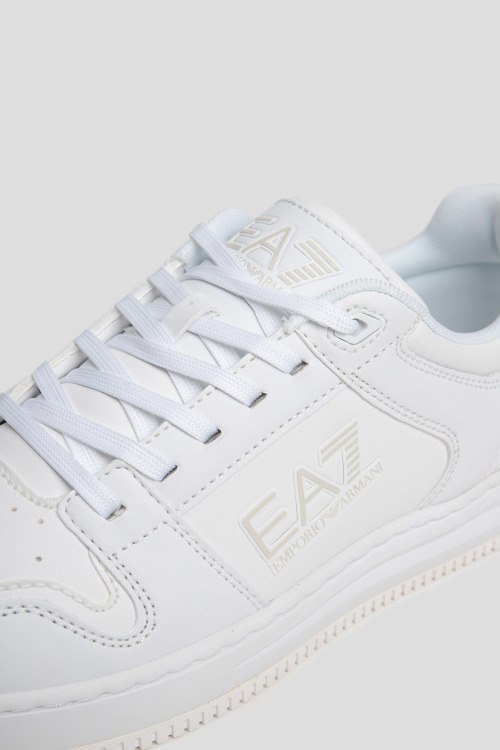 Детали: Мужские белые кеды из экокожи от EA7 Emporio Armani (ЕА7 Эмпорио Армани). Закругленный носок, комбинация материалов, спереди классическая шнуровка, логотип бренда, резиновая подошва в тон изделия