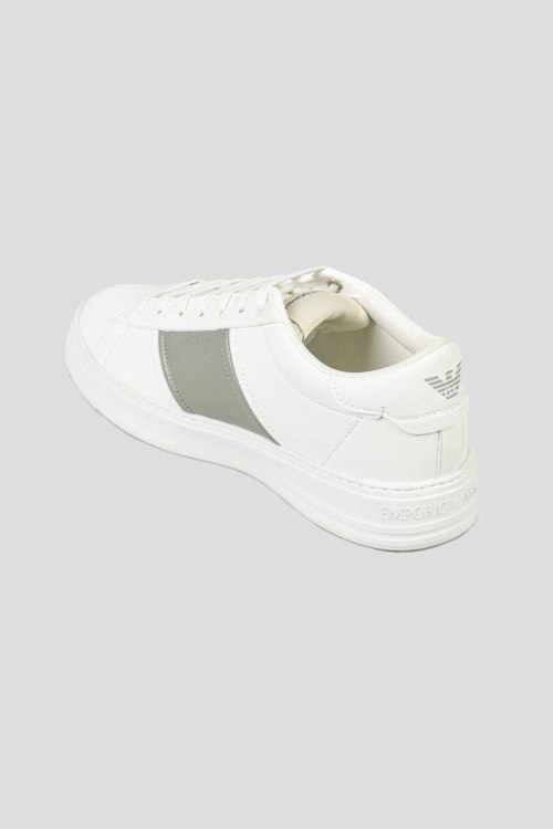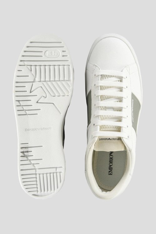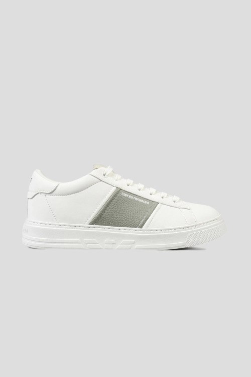 Детали: Мужские белые кожаные кеды от Armani (Армани). Модель из гладкой и зернистой кожи, логотип сбоку и на язычке, классическая шнуровка, закругленный носок, белая подошва