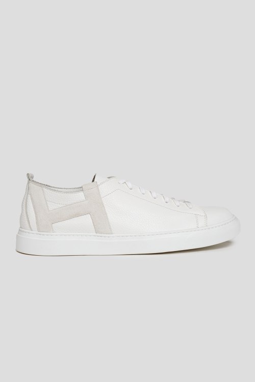 Детали: Мужские белые кожаные кеды от Henderson Baracco (Хендерсон Баракко). Модель из зернистой кожи, нашивка с логотипом, классическая шнуровка, закругленный носок, резиновая подошва